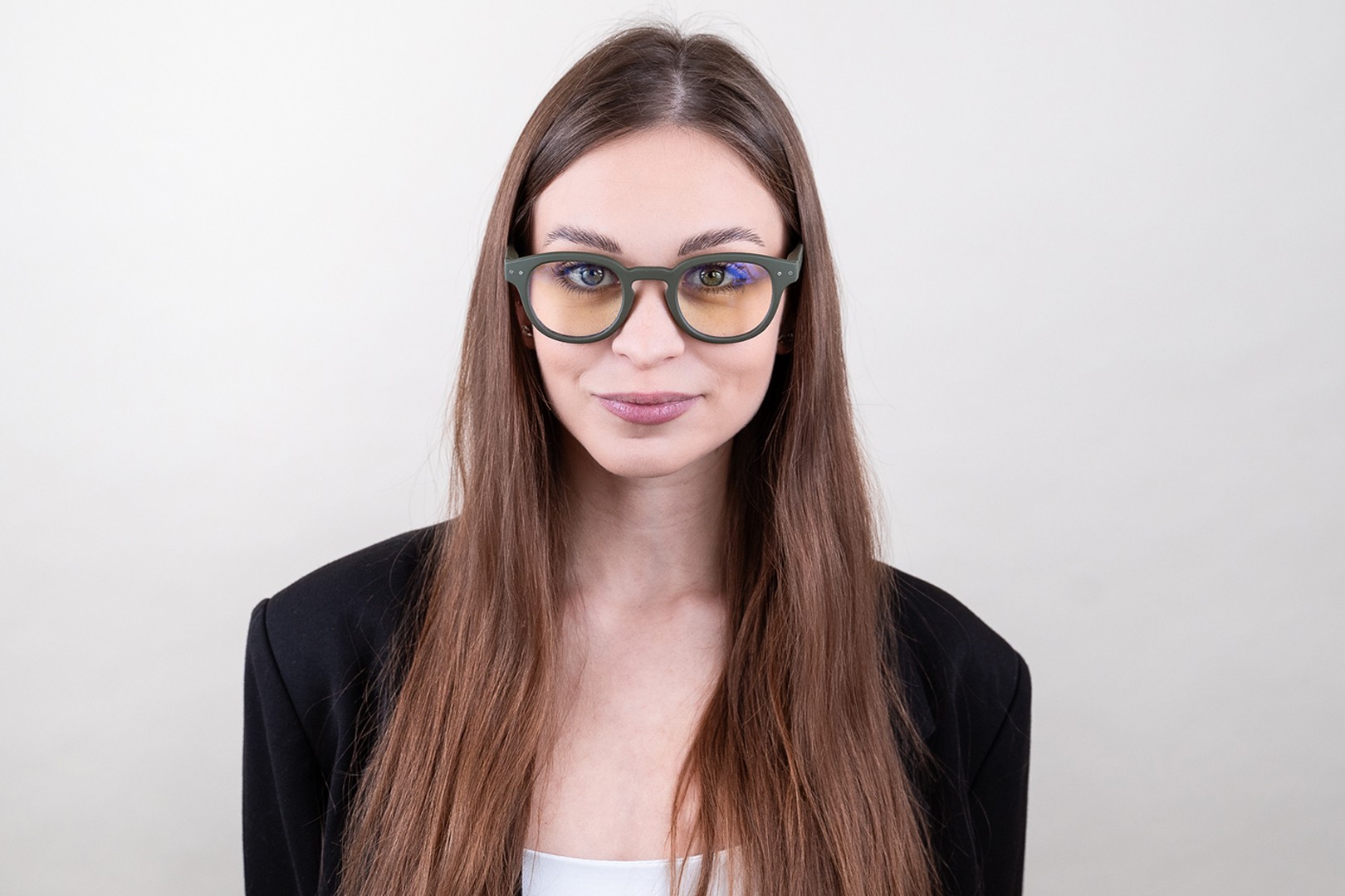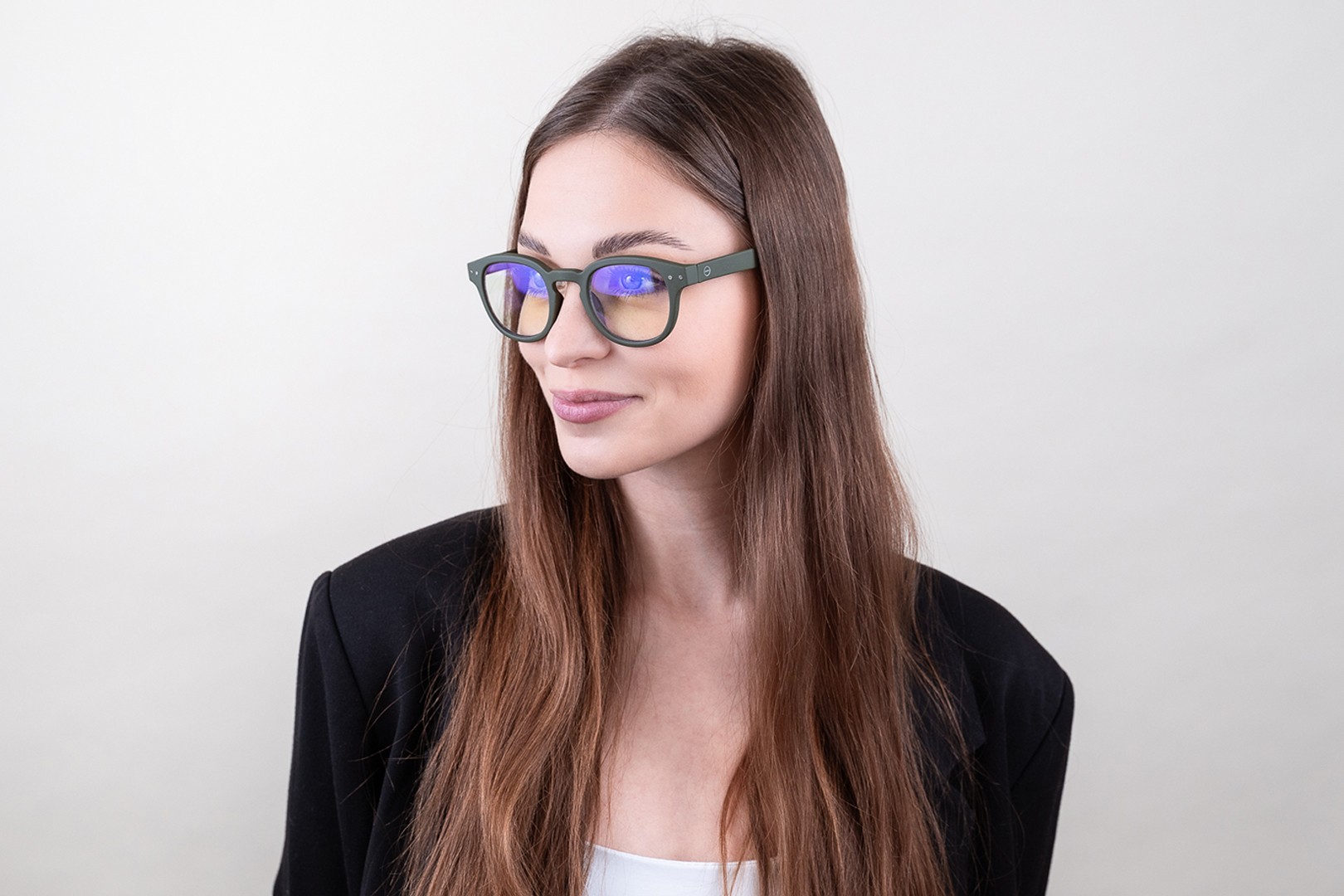 - Žalia rėmelio spalva puikiai tinka šaltam odos atspalviui ir tamsiai rudiems, juodiems arba raudoniems plaukams.