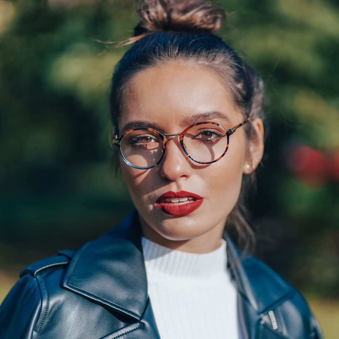 - Mėlyna rėmelio spalva puikiai tinka šaltam odos atspalviui ir šviesiai rudiems, juodiems arba šviesiai blondiniams plaukams.